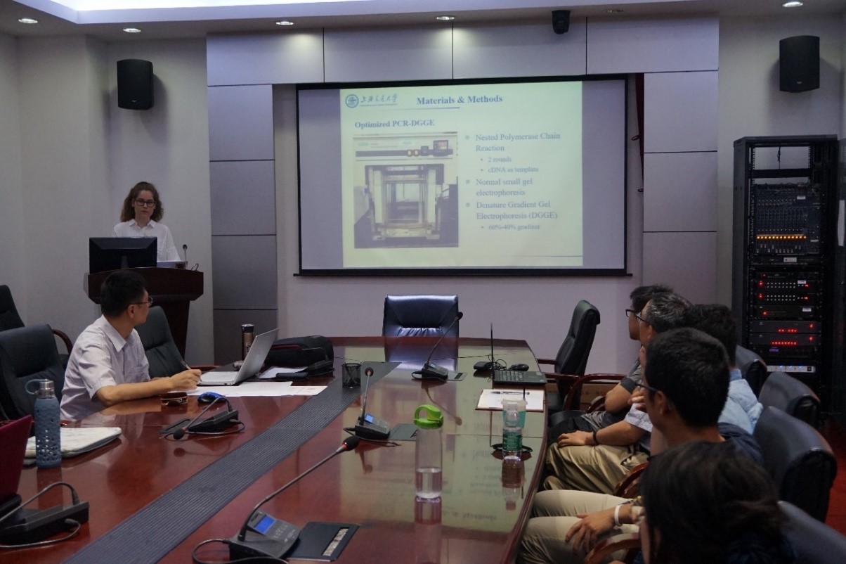 在两个月的实习中,来自加拿大渥太华大学的Ayni Sharif、Isaac Junsoo Kim、Svetlana Zdero和Djeneba Keita等4名学生分别在李卫东、陈海峰、马伟等老师的实验室积极投入研究工作,并取得非常好的进展。7月26日学院组织了渥太华科研项目实习汇报会。各研究小组介绍了各自的研究工作和成果,并与参会老师们和同学们进行热烈而深入的探讨。Ayni Sharif、Isaac Junsoo Kim向大家介绍了在李卫东教授实验室开展小鼠大脑透明化实验以及BCL9基因敲除小鼠在社会、抗抑郁、恐惧等行为的影响;Svetlana Zdero采用优化的PCR-DGGE 技术在40例中国肺腺癌患者的EGFR 18号外显子中检测到了一例罕见突变,相关研究为肿瘤临床精准治疗提供了有价值的信息; Djeneba Keita 采用新的力场分析算法预测了IDP 蛋白的结构,通过自行编写程序、调整参数等,使预测结果大大接近实际值。汇报会上由老师和同学们共同评选出最佳项目奖,并给参与项目的同学颁发了项目结题证书和优秀项目证书。