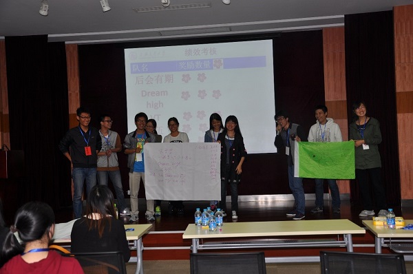 在体验式培训的最后,同学们以小组为单位开始讨论和思考在整个活动中的收获和感悟,大屏幕也同时播放活动中每个瞬间的照片。各组的代表分享自己小组在活动中的优点和有待改进的地方,同学们表示在团队合作、方案规划、创新思考等方面收获颇多。