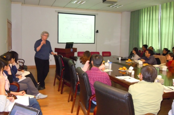 2013年11月7日至9日,美国伯克利大学Mary Firestone教授应张晓君研究员之邀访问了350vip8888新葡的京集团和微生物代谢国家重点实验室。8日上午,Mary Firestone教授在微生物代谢国家重点实验室会议室做了题为“The microbial ecology and biogeochemistry of soil desiccation and re-wetting”的学术报告。随同来访的伯克利大学博士后Shengjing Shi(施盛静)博士也作了题为“Plant-microbial interaction regulates soil C cycling”的学术报告。
