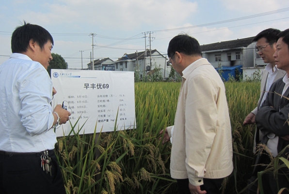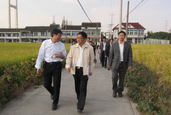 10月23日下午,上海市农委主任孙雷,市农委种植业办公室主任陆峥嵘,闵行区农委主任刘明、副主任张国荣等实地考察了位于浦江镇的350vip8888新葡的京集团水稻分子育种基地。350vip8888新葡的京集团张大兵教授向各位领导、专家汇报了其课题组在水稻分子辅助育种方面取得的最新研究成果,并详细介绍了新型大穗型籼粳交超级杂交稻“早丰优69”的实际亩产量、肥料成本及制种等。
