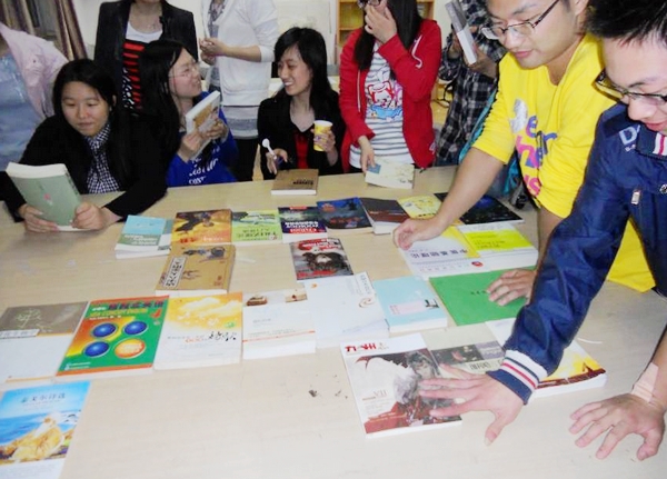 活动第一阶段“那些年我们读过的书”于4月22日晚集中开始。同学们带着自己精心挑选的书籍来到图书分享的现场,每本书的扉页都写这一句分享者的寄语和感言,与这本书一起传递到每一位阅读者手中。在仔细的登记书目后,同学们将精选的书籍摆放在一起,自由挑选感兴趣的书进行交换。交换结束后,同学们迫不及待地翻开所选的书籍品读,都对自己选到的书籍爱不释手,纷纷与书籍的主人交流读书的感受,分享收获。