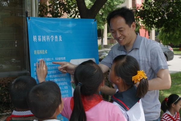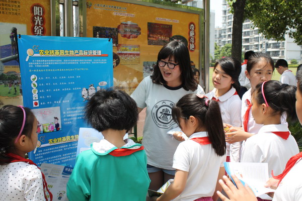 16日中午,上海交大的师生又在交大实小开展以“与转基因植物相识、相知和相处”为主题的转基因植物科普宣传活动。上海交大的师生带去了内容丰富的科普展板和宣传手册,并对上面的知识内容进行详细的讲解。小学生们十分喜欢这些知识,并积极的回答大学生哥哥姐姐的问题。
