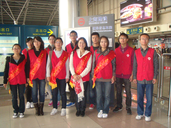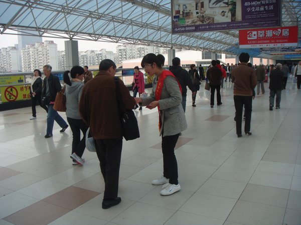 8日上午9时,参加活动的全体学生党员来到莘庄地铁站从事志愿者服务和宣传党的十八大工作。志愿者身穿志愿服,给行人指路、引导。遇到不熟悉的路,同学们纷纷掏出手机,拿出地图查阅,非常热心;在地铁安检口时不时传来志愿者“你好,行李请过安检”、“您请这边走”的热情洋溢的声音。
