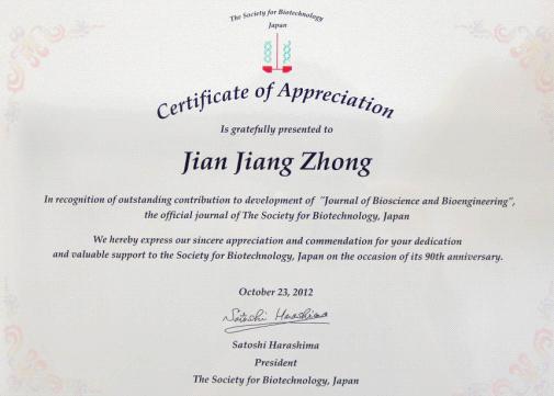 日本生物工学会授予钟建江教授的感谢状