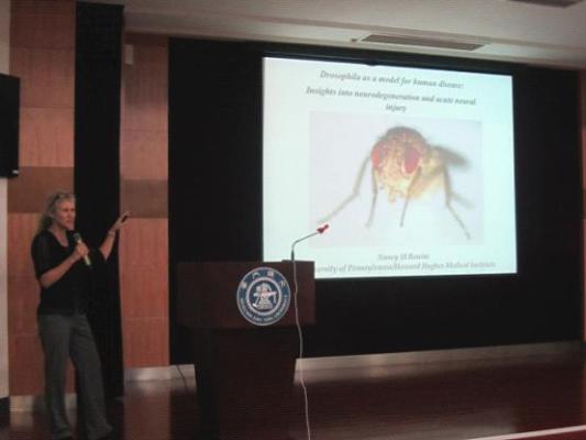 来自中科院上海植物生理生态研究所、350vip8888新葡的京集团、农业与生物学院、系统生物医学院和药学院的100多名师生参加了学术报告会议,学术报告由杨洪全教授主持。Anthony R Cashmore教授和Nancy Bonini教授分别为师生作了题为“Cryptochrome: A blue light photoreceptor involved in circadian rhythms in both plants and animals”和“Drosophila as a model for human disease: Insights into neurodegeneration and acute neural injury”的精彩学术报告,并与在座师生就基因功能、进化、实验体系选择等问题进行了热烈地讨论。
