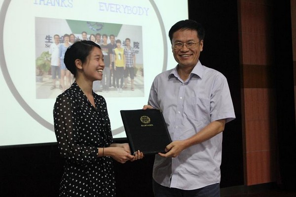 在一个多月的时间内,各课题组的交大学生和哈佛学生分工明确,配合默契,科研训练进展非常顺利。8月6日,暑期科研训练班在生物药学楼树华多功能厅举办总结交流会。训练班交大方面负责人赵立平教授、训练班导师李卫东教授、哈佛大学学生领队Grace Xiong出席了总结交流会。参与科研训练的哈佛同学和交大同学以课题组为单位,围绕课题背景、研究方法、实验结果、分析讨论及未来计划等方面进行了汇报。每组汇报完成之后,师生之间进行了热烈的讨论和交流。最后,赵立平老师总结发言。他对同学们的实验成果、课题进展表示肯定,对暑期科研训练班即将顺利完成表示祝贺,同时,他期待今后两校开展更多的交流合作。Grace Xiong对交大方面的精心组织、热心帮助表示感谢,并向导师和带管研究生赠送纪念品。