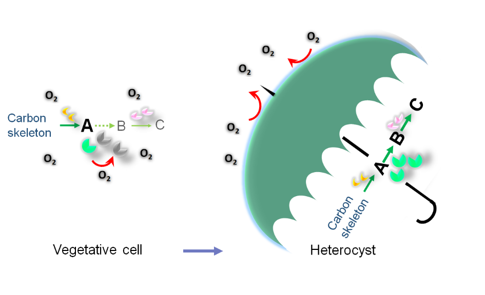 为了解决蓝藻中产氧底盘和氧敏感元器件的不适配问题,研究团队师从大自然的智慧,创造性提出了一种利用自然细胞分化进行空间分割的策略,实现了氧敏感元器件在产氧生物中的功能性组装。研究团队以1,3-丙二醇(1,3-PD)生物合成途径作为模式代谢途径,在底盘蓝藻鱼腥藻中完成了厌氧途径的组装,然后利用缺氮条件诱导细胞特化为异型胞,形成的微氧环境,保护途径中的氧敏感酶甘油脱水酶(GDHt)元件,实现了1,3-PD的光驱动生产。
