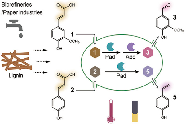 木质纤维素/农业废弃物的高值化利用可以有效地将石油化学品的替代生产与环境可持续性发展进行偶联。目前,木质素废物流通常被用于燃烧产生热量,伴随大量的环境污染。因此,开发将木质素转化为高值化合物的绿色工艺对生物炼制的发展至关重要。然而,传统生物合成途径对昂贵辅酶(ATP和CoA)的不断需求严重阻碍了木质素水解单体的有效利用。该研究开发了一种基于新型酚酸脱羧酶(Pad)和芳香酚单双氧酶(Ado)的不依赖辅酶的生物催化剂,并将其用于木质素水解物的高值化利用。除此之外,在先前开发的通过温度来控制香草醛/醇合成的技术基础上,该研究提出了第二代技术-温度/pH导向策略,使木质素的主要水解单体同时转化为13.3 g/L香草醛和20.5 g/L 4-乙烯基苯酚。这些产物广泛用于香料、聚合物材料、光敏电阻和半导体的制造。该辅酶不依赖的催化剂还可以用于许多其他木质素来源芳香化合物的高值化,这个绿色的生产技术将为生物炼制整体效率和经济性的提高铺平道路。