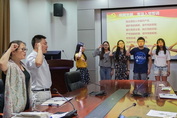 会议伊始,仰颐为六位学生党员佩戴党徽,以此激励党员同志强化宗旨意识和责任意识,要勇于亮出党员身份。随后,毕业生党员面对党旗重温入党誓词。