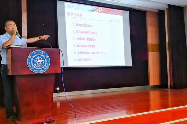 随后,杨立志科长用交大校园内发生的交通事故视频集锦警示大家,让同学们切身体会遵守交通规则,树立安全意识的重要性。并通过讲解2018年六个校园内典型案例,告知同学们遇到紧急情况的防范措施,及时拨打校园应急电话54749110。