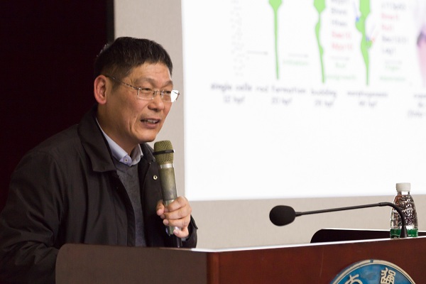彭金荣教授的主要学术成就包括赤霉素作用的分子机理研究和以斑马鱼为模式动物研究肝脏发育和再生的分子调控机制研究。报告中,彭教授介绍了自己课题组在植物激素赤霉素信号传导领域开展了系统的研究工作,发表了20篇有重要影响的论文(包括Nature、Science),特别是已写进教科书的赤霉素“去抑制生长”的作用机制,为人们认识赤霉素作用的分子机制作出了重要贡献。接着,彭教授着重介绍了斑马鱼肝脏发育的调控机制。核仁具有“核中核”之称,彭金荣教授实验室以斑马鱼为遗传模式材料,研究肝脏早期发育的遗传调控机理,近十年来发现多个核仁因子参与调控肝脏发育。最近他们发现斑马鱼Mpp10和Sas10均是保守的核仁蛋白,并且对斑马鱼消化器官的发育至关重要,Mpp10和Sas10均参与18S rRNA的加工过程,Mpp10和Sas10从斑马鱼胚胎发育早期就开始形成稳定的复合体,并且这两个蛋白稳定性互相依赖。进一步研究发现Def通过与Sas10互作形成Def-Sas10-Mpp10复合体可能促进了CAPN3对Mpp10的降解,同时发现Sas10通过与Mpp10结合遮蔽Mpp10上CAPN3的识别位点从而保护Mpp10不被CAPN3降解。因此,在脊椎动物早期器官发育过程中,核仁蛋白Def,Sas10,Mpp10,Bms1l和Rc1l不仅参与18S rRNA的加工成熟,还在肝脏发育中起重要作用。