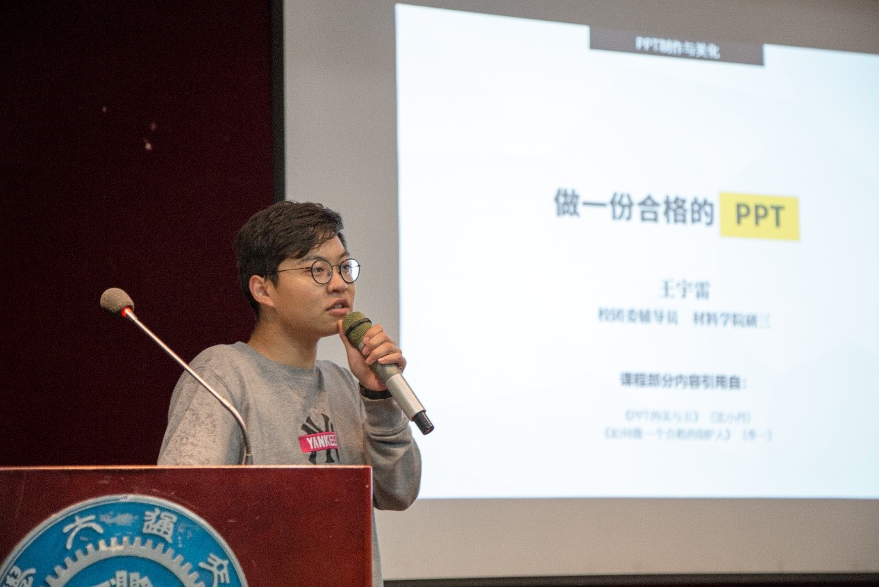 王宇雷以“做一份合格的PPT”为题带来PPT的制作技巧讲座。他强调PPT有外观和内涵两大要素,从PPT“对比、重复、对齐、亲密”四大原则出发深入浅出地展开叙述,通过优秀作品展示,生动形象地演示制作技巧。最后他说到,PPT制作理论知识固然重要,但更需要注重实践,在实练中不断提高。