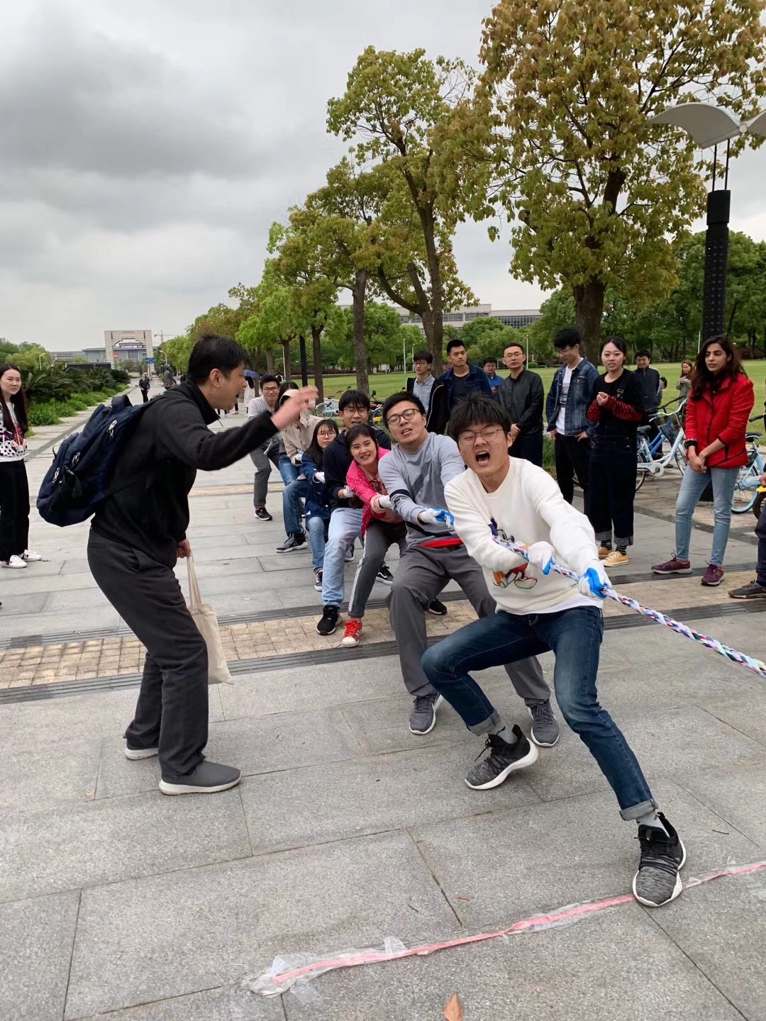 拔河比赛采用淘汰赛制,两两对决,最后争夺冠亚季军。随着比赛的哨声响起,两边队员喊着整齐的口号,使出浑身力气将绳子往后拉,导师们也在旁助阵加油。最终,陈海峰团队夺得冠军,韦朝春团队获亚军,吕晖、俞章盛团队获季军。