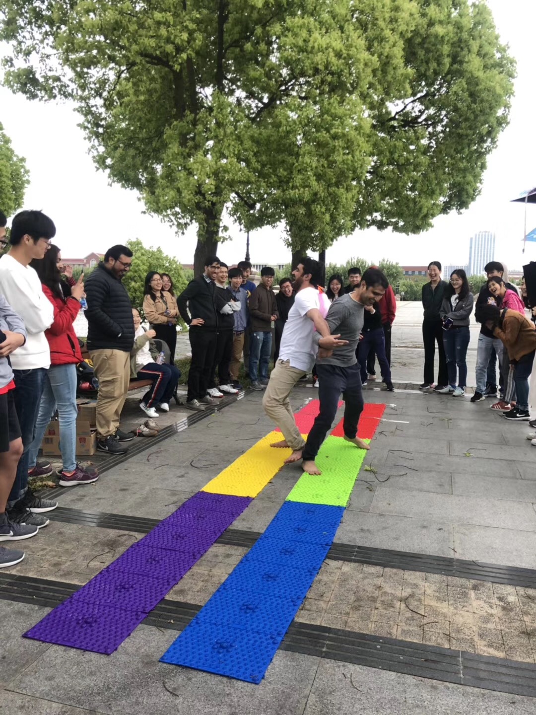 指压板夹球是一项考验团队信任度与默契度的比赛,要求参赛队员脱鞋上指压板,夹球来回到达终点,以最短计时获胜。最终生统中心的周晓城和魏欢欢两人步调一致,以6秒47的成绩获得冠军。
