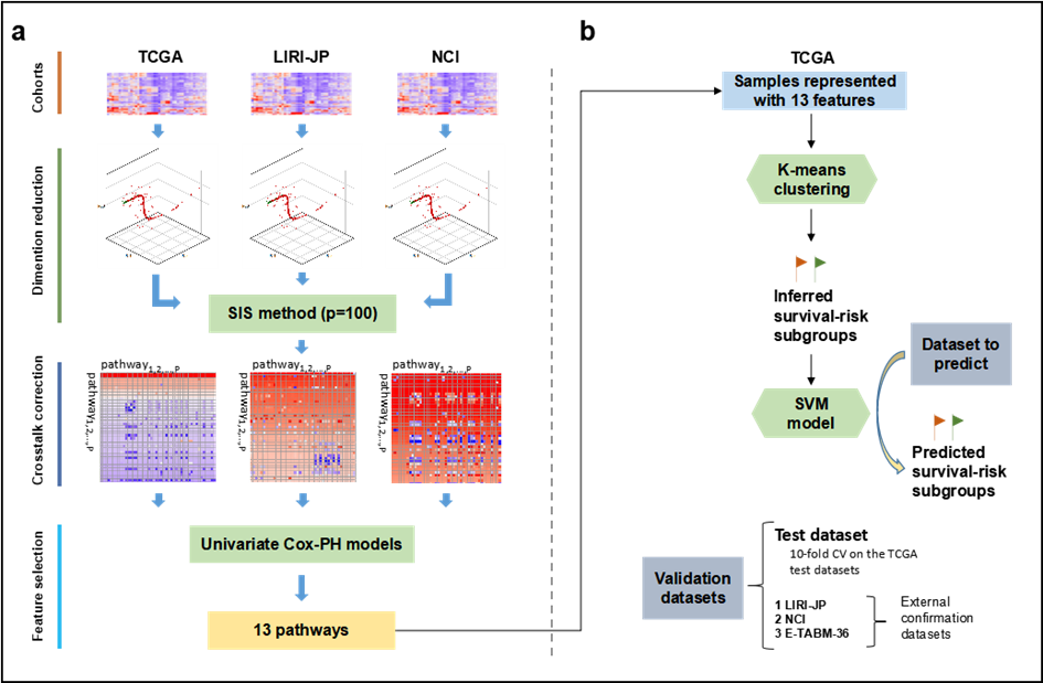 肝癌是一种发病率和致死率双高的肿瘤类型,多年来全球流行病学统计中呈上升趋势,特别是在亚洲发展中地区。目前肝癌的治疗方法十分有限,以PD-L1等为靶点的新疗法在肝癌临床研究中的效果并不显著。统计发现,肝癌的五年生存率不到18%,因此,肝癌疾病相关研究十分重要。大多数肿瘤类型研究惯常的分析方法是通过临床或者高通量数据对肿瘤患者进行分类,从而实现对不同的临床风险类型采取更加个性化的治疗方法。目前相关研究已经有了较大进展,并发现一些重要的生物标志物。最近一篇基于深度学习对肝癌高通量表达数据进行降维后构建风险预测模型的研究将肝癌分为生存风险高、低两类,并在多个肝癌数据中实现了较为精准的预测。与其他肿瘤研究横向比较,该研究提出的模型预测性能还存在较大的提升空间,并且基于深度学习框架的模型解释性也需要改善。另一方面,由于高通量数据维度高,噪声比较明显,已有研究发现基因水平标志物的预测性能不稳定,并且数据集中训练样本的不同组合对于标志物的发现也存在很大的影响。