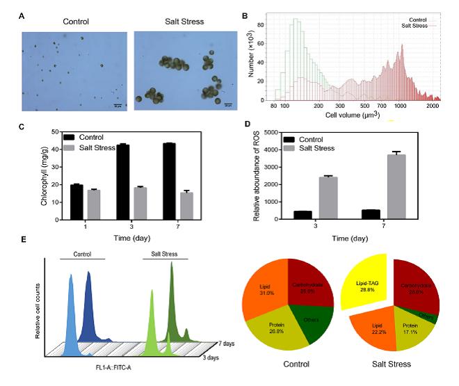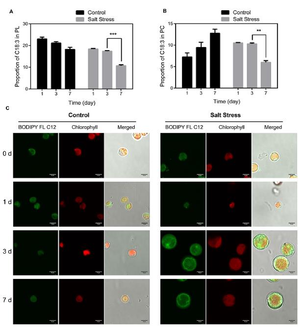 目前对盐胁迫响应机制的认识主要集中在膜的离子运输、抗渗透物质的积累、抗氧化功能的提高这些方面。本研究中发现了一种由脂滴(Lipid Drops, LDs)介导的盐胁迫响应新机制。采自新疆盐湖的一种小球藻Parachlorella kessleri在0.35 M NaCl胁迫条件下,细胞体积变大、胞内LDs含量显著上升。进一步对这些LDs的分布、LDs蛋白质组、脂质组、及其脂肪酸动态分布的分析,并结合转录组数据和醋酸改变LDs含量的实验,推测LDs在抗盐胁迫中具有为细胞膜面积的增大及膜脂脂肪酸组成的改变提供了原料及相关酶类;协同自噬参与盐胁迫条件下细胞内物质的再循环利用;具有储存胞内蛋白的功能(可能与盐胁迫解除后细胞的快速恢复有关)等多种功能。同时阐明了Parachlorella kessleri小球藻中脂滴介导的盐胁迫响应机制。此外,研究团队对盐胁迫增大的微藻细胞的生物柴油生产潜能进行了评估,提出通过提高DNA含量增加油脂产量进行生物柴油生产的思路。