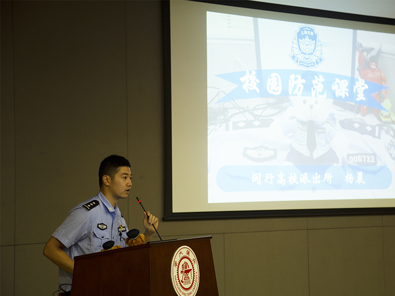 闵行高校派出所干警杨晨进行安全教育,并和现场同学进行互动交流。