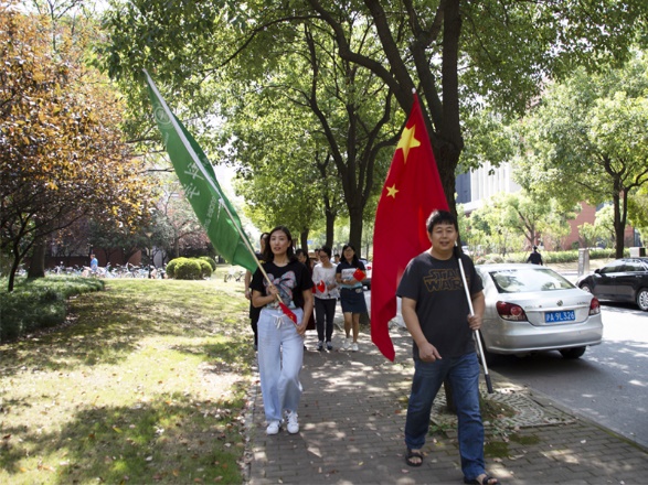 健步走活动正式开始。两名旗手高举国旗和院旗,昂首阔步,教师们手中挥舞小旗,精神抖擞,步伐矫健。