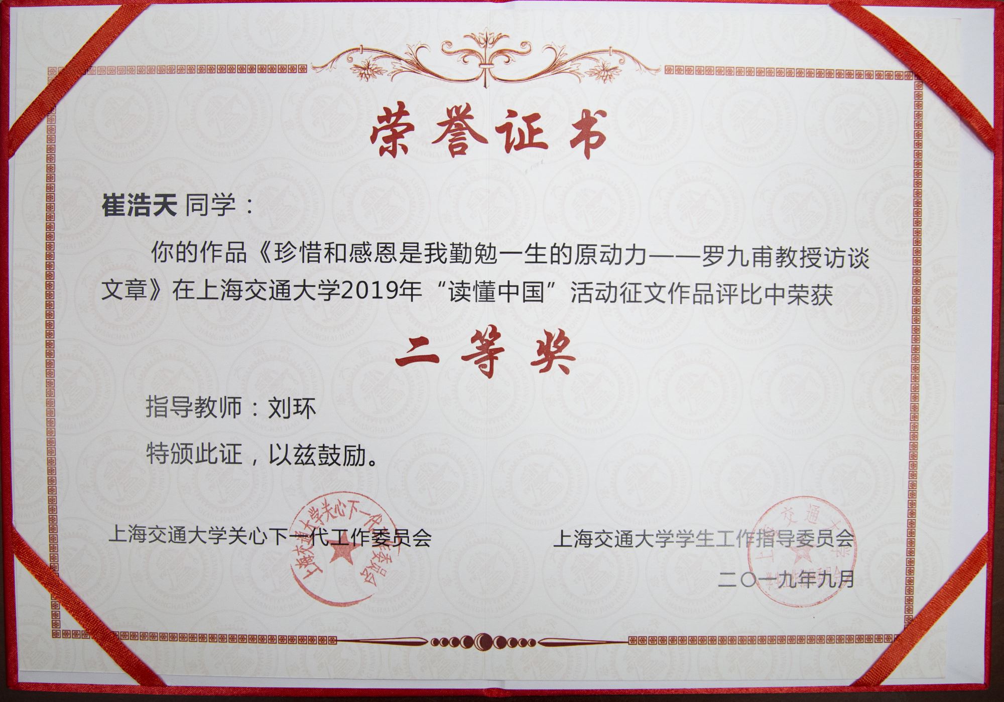 《珍惜和感恩是我勤勉一生的原动力——罗九甫教授访谈文章》荣获350vip8888新葡的京集团“读懂中国”活动征文作品二等奖。