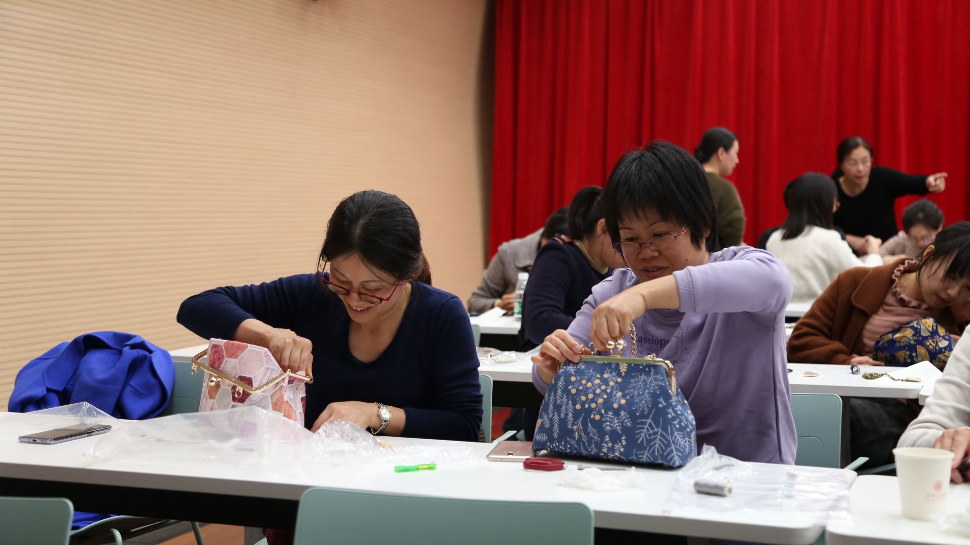 随后,大家在手工老师彭世红的指导下纷纷开始自己的编织,不同的色彩组合,不同的编织技巧,不同的搭配装饰,让简简单单的手袋在通过制作变得独一无二,完成作品后大家纷纷拿起自己制作的小包合影留念。大家从这一精细的手工活动中体会到了亲自创作的魅力。