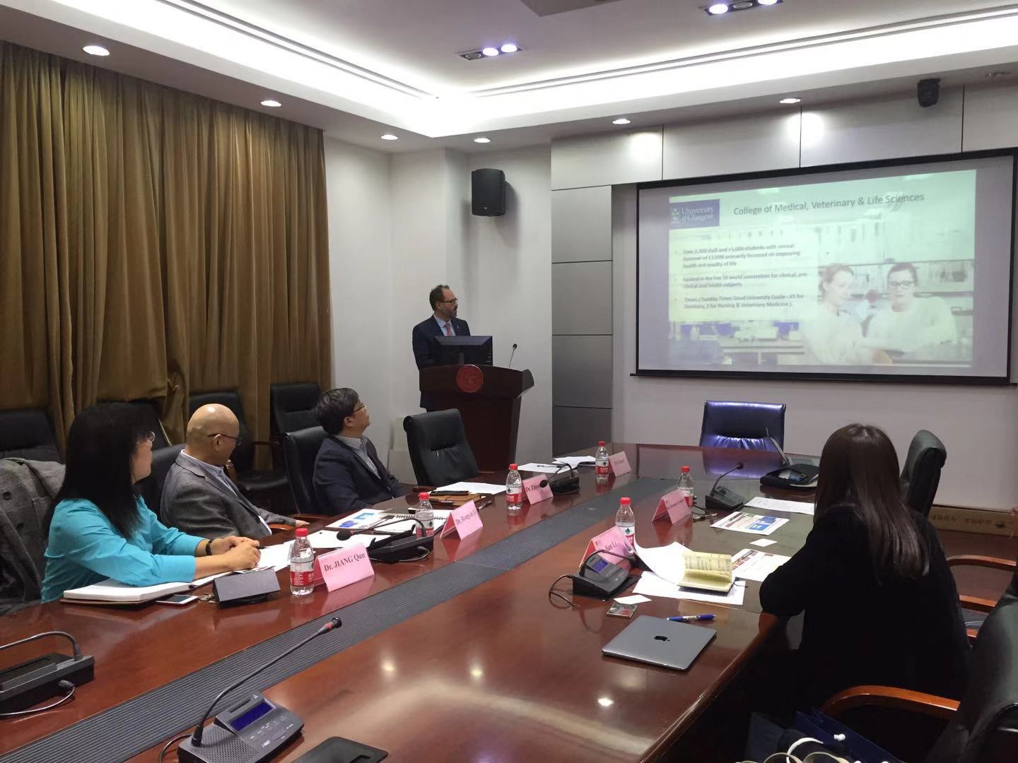 11月25日上午英国格拉斯哥大学(University of Glasgow)医学院国际化院长Christopher Loughrey教授和格拉斯哥大学东亚区项目经理李健一行来访350vip8888新葡的京集团,学院副院长李志勇、生物工程系教授李荣秀、院长助理蒋群、人才培养国际化专员夏娟与会。