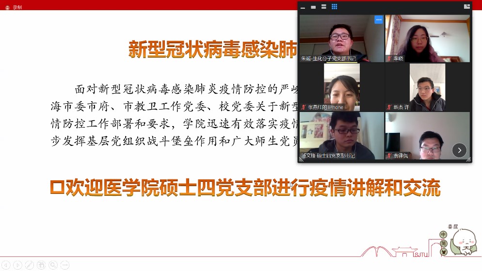 最后,双方展开了热烈讨论。医学院硕士第四党支部进行了抗疫志愿分享,讲述了作为“准医生”面对这场突如其来疫情的想法、做法。生化系党支部谈及食野味的恶俗,提出仅仅关闭大型野味交易市场远远不够,还应该注重民众的宣传教育,从思想上改变民众的想法。张燕红说道,作为党员,要更好地将入党宣誓中“随时准备为党和人民牺牲一切“实践在行动中。翁律侃从学生当前三个身份提出学生要不断加强专业知识与技能的学习,积极投身防疫的志愿服务中,在公共卫生预防工作中做更多地探索。大家表示,通过这次特殊的线上组织生活会,收获了很多感悟,希望待到春暖花开时,大家彼此见面,给对方一个大大的拥抱。