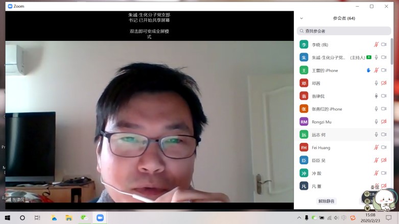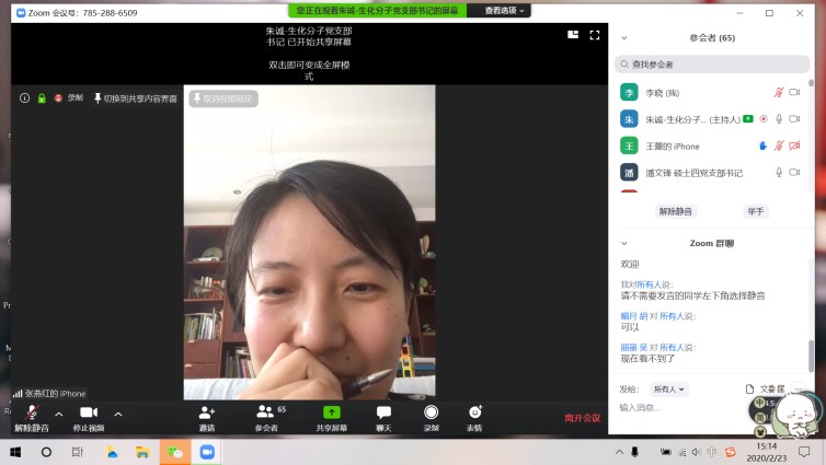 2020年2月23日,针对目前新型冠状病毒肺炎疫情防控的严峻形势,350vip8888新葡的京集团生物化学与分子生物学系研究生党支部与医学院硕士第四党支部联合召开线上专题组织生活会。医学院研究生办公室主任翁律侃、辅导员杨璐,350vip8888新葡的京集团学生党总支书记张燕红、特邀党建组织员陆秀英及两个支部72位学生党员共同参会,会议由生化系研究生党支部书记朱诚主持。