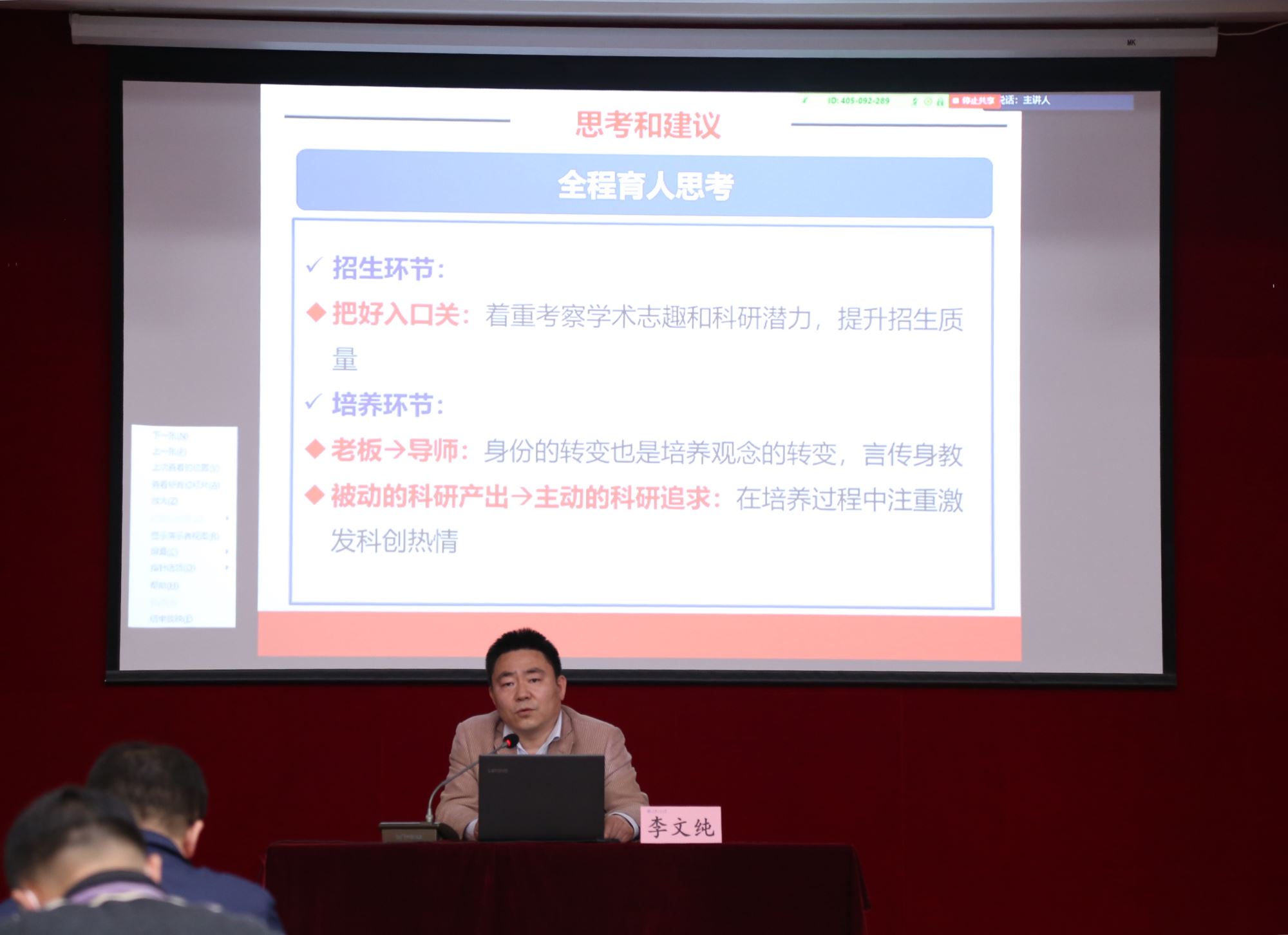 学院党委副书记李文纯作“以价值引领为核心,以就业引导为牵引的全员育人工作思考”报告,传达了学校就业引导大会精神,介绍了学院就业引导工作概况,分析了目前学生就业引导工作存在的问题,并从全员、全程、全方位三个层面进行分析,提出就业引导工作建议。他进一步强调,招生、培养、就业是一个全链条的育人体系,导师是研究生培养的第一责任人,要引导学生提高学术志趣,针对群体特点做好价值引领和专业志趣提升,为学生搭建高水平的学术平台。