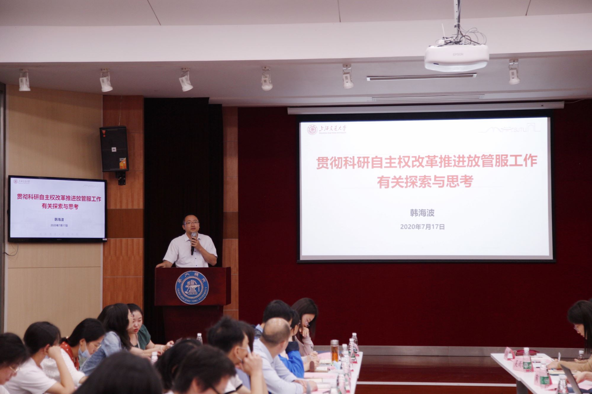 科研院项目管理中心主任韩海波作题为《贯彻科研自主权改革推进放管服工作有关探索与思考》的报告。从高校自主权放管服改革大背景入手,剖析了科研管理的五个发展阶段,从“科学性”、“多重性”、“体系性”等多个特性进行了分析解读,并提出了“管理与服务、规范与高效统一”的发展方向。