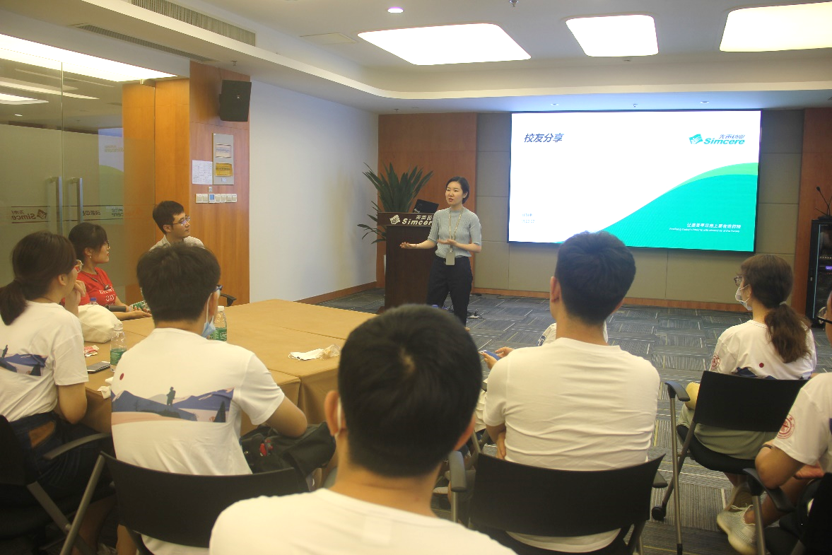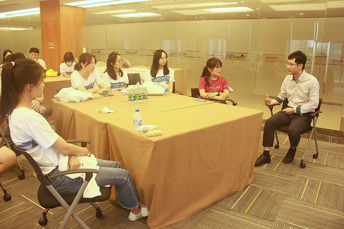 实验室参观结束后,陈怡给实践团成员详细介绍了公司的研发实力、团队水平和产品布局,并就生物医药领域的未来发展分享了自己的看法。随后350vip8888新葡的京集团校友、任职于先声药业研发部门的徐祖朋给实践团成员们分享自己的经历以及对就业择业的看法。徐祖朋曾任职过多家企业,就第一份工作的选择以及职业的转换给同学们提供了宝贵建议。
