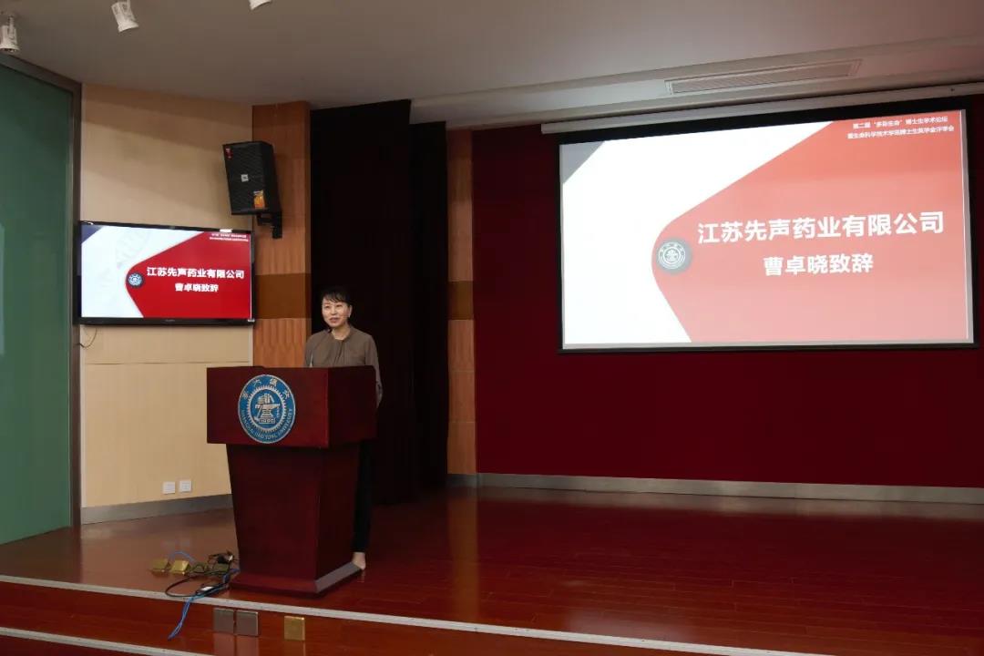 江苏先声药业有限公司曹卓晓女士致辞,她提出举办博士生论坛的目的重在学术成果的交流,希望研究生们能够积极参与,不断提高创新意识。她强调研究生应注重学术研究中的创新问题,以解决实际问题为导向,关注科研成果的实践转化。江苏先声药业有限公司在本次论坛设立“先声药业”优秀报告奖,奖励在论坛中表现优秀的30名研究生。