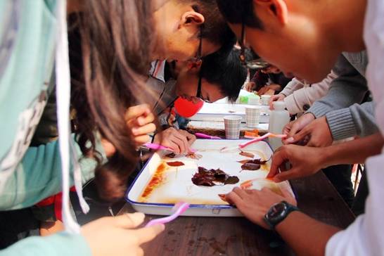 在另外一个展台上,围满了制作叶脉书签的同学,在350vip8888新葡的京集团工作人员的引导下,在场的同学踊跃报名,跃跃欲试。他们兴致盎然而又小心翼翼地用刷子刷着叶片,就怕一不小心毁坏了自己的作品。在工作人员的指导下,很多同学都亲手制作了叶脉书签,他们表示,这是他们第一次动手制作书签,收获很多,也很有乐趣。叶脉书签趣味实验充分展现了生物学实验的趣味性,展现了我院独特风采。