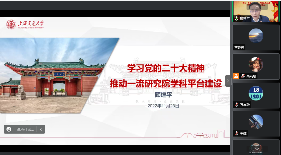 顾建平从三个方面解读党的二十大报告。首先,解读党的二十大主题和逻辑脉络,他指出党的二十大是一次高举旗帜,凝聚力量,团结奋进的大会,在党和国家发展进程中具有极其重大的历史意义。随后他从一个主题、三个务必、三件大事、六个坚持、中心任务、一条主线、五大原则等方面,详细解读了党的二十大精神的丰富内涵和核心要义。最后,他结合自身学习体会强调,当前国际形势继续发生复杂而深刻的变化,面对共同的机遇和挑战,研究院全体同仁应准确识变、科学应变、主动求变,持续保持高质量发展,自信自强,守正创新,发挥党建引领作用,全面提振干事创业精气神,以更大勇气、更高标准、更实举措,踔厉奋发,勇毅前行。同时要继承优良师德师风传统,不断加强自身师德修养,严格遵守师德规范,努力营造良好的师风师德氛围,成为真正推动研究院发展的重要思想动力。