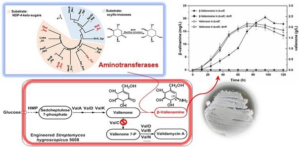 药物合成生物学是通过工程化的系统设计,用标准化和模块化的元素在生物系统中重构所需的人工合成体系,从而完善药物创新和优产的新模式。β-井冈霉烯胺属于C7N氨基环醇类,其衍生物作为β-糖苷酶抑制剂类药物的先导化合物,可用于治疗溶酶体贮积症等遗传代谢性疾病。由于C7N氨基环醇类分子结构中存在多个手性中心,化学合成难度很大,极大地限制了药物创新和应用,因此从上世纪八十年代至今,国际上对其高效合成途径在不断探索中。