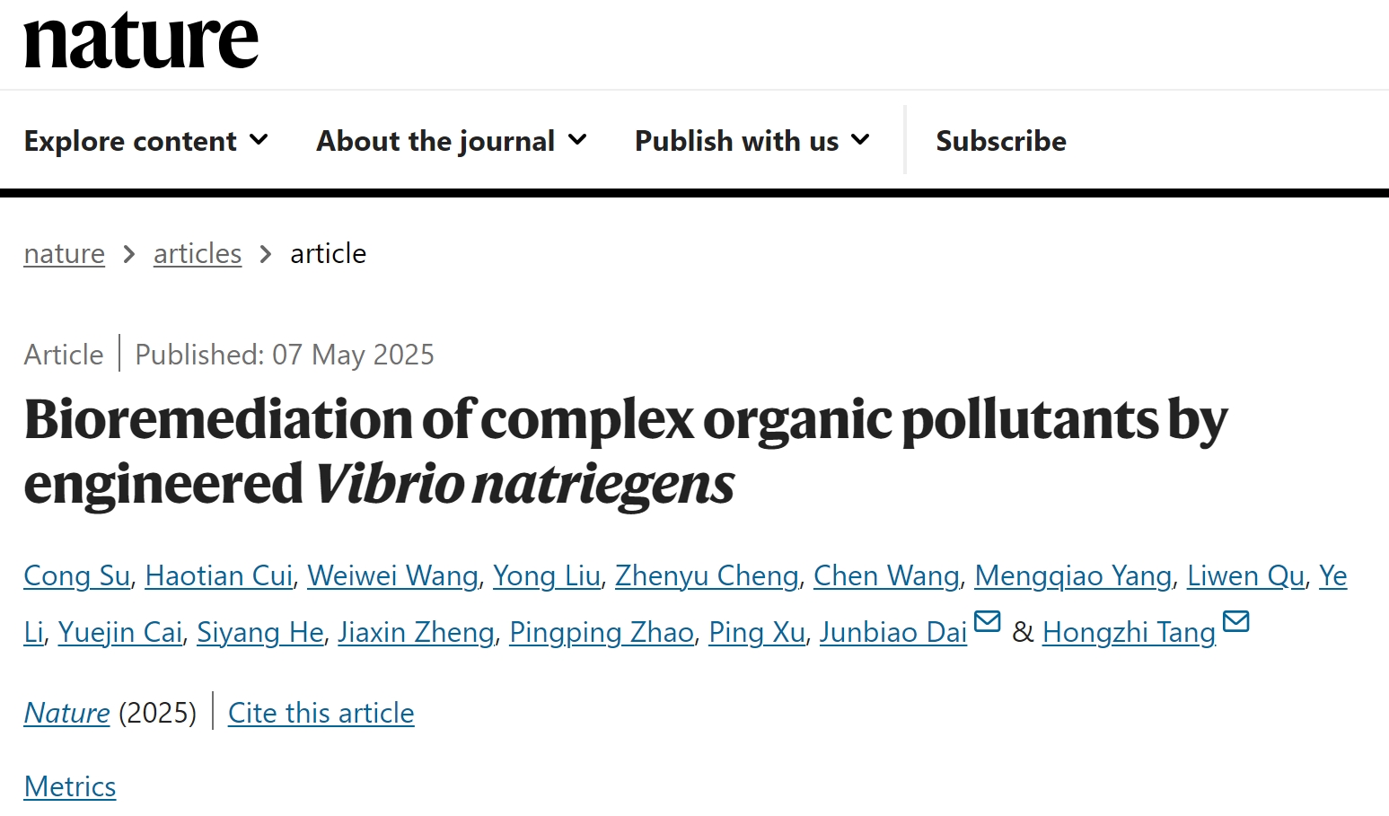 近日,350vip8888新葡的京集团、微生物代谢全国重点实验室唐鸿志团队与中国科学院深圳先进技术研究院/中国农业科学院深圳农业基因组研究所(岭南现代农业科学与技术广东省实验室深圳分中心)戴俊彪团队合作,在环境微生物技术研究方面取得进展,用合成生物学方法构建的需钠弧菌工程菌株能在高盐工业废水和高盐土壤中同时降解多种有机污染物。该项研究为解决石化废水排污、海洋石油泄漏等全球性环境问题提供了全新的技术方案。相关研究成果以“Bioremediation of complex organic pollutants by engineered Vibrio natriegens”为题,于2025年5月7日在线发表在《自然》(Nature)上。