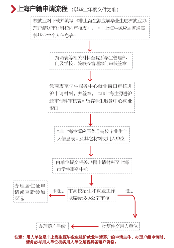 1.用人单位是非上海生源毕业生进沪就业申请落户的申请主体,请务必向用人单位核实该单位是否具备为非上海生源毕业生申请本市户籍的资格。非上海生源毕业生进沪就业申请落户,须由用人单位一次性提交申请材料。如未通过落户申请,不再受理由其他用人单位提交的申请材料。