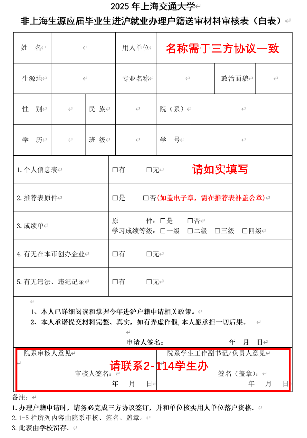 2.2025年《非上海生源应届毕业生进沪就业办理户籍送审材料校内审核表》(简称:白表)。