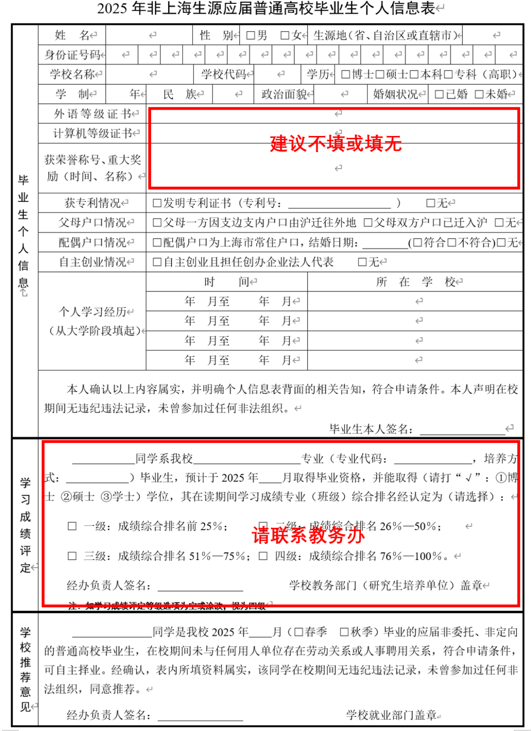1.《2025年非上海生源应届普通高校毕业生个人信息表》(简称:蓝表,需正反双面打印。 表中的外语等级证书、计算机等级证书、获荣誉称号等内容建议不填或写无(我校毕业生落户无需提交该材料),如填写了相关记录,需提交对应佐证材料原件和复印件。)