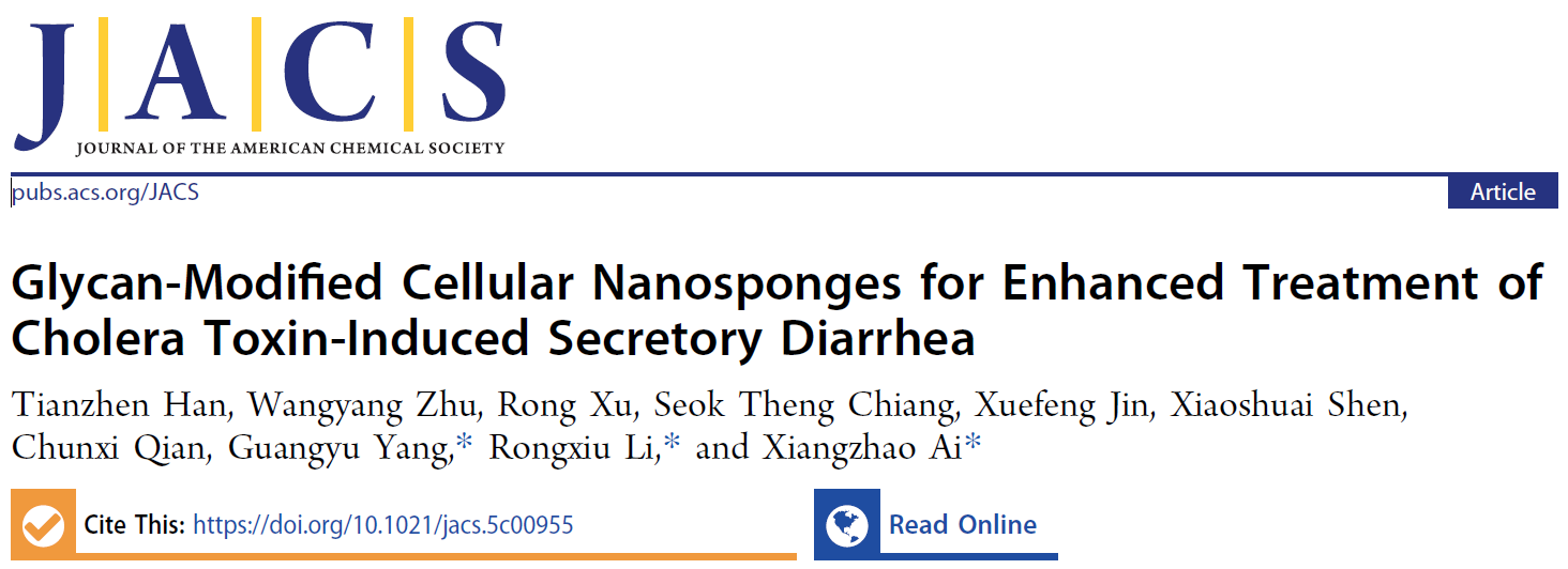 近日,国际权威期刊Journal of the American Chemical Society(JACS)在线发表了题为“Glycan-Modified Cellular Nanosponges for Enhanced Treatment of Cholera Toxin-Induced Secretory Diarrhea”的研究论文,350vip8888新葡的京集团博士生韩田振为第一作者,艾相昭长聘教轨副教授、李荣秀教授和杨广宇研究员为共同通讯作者。