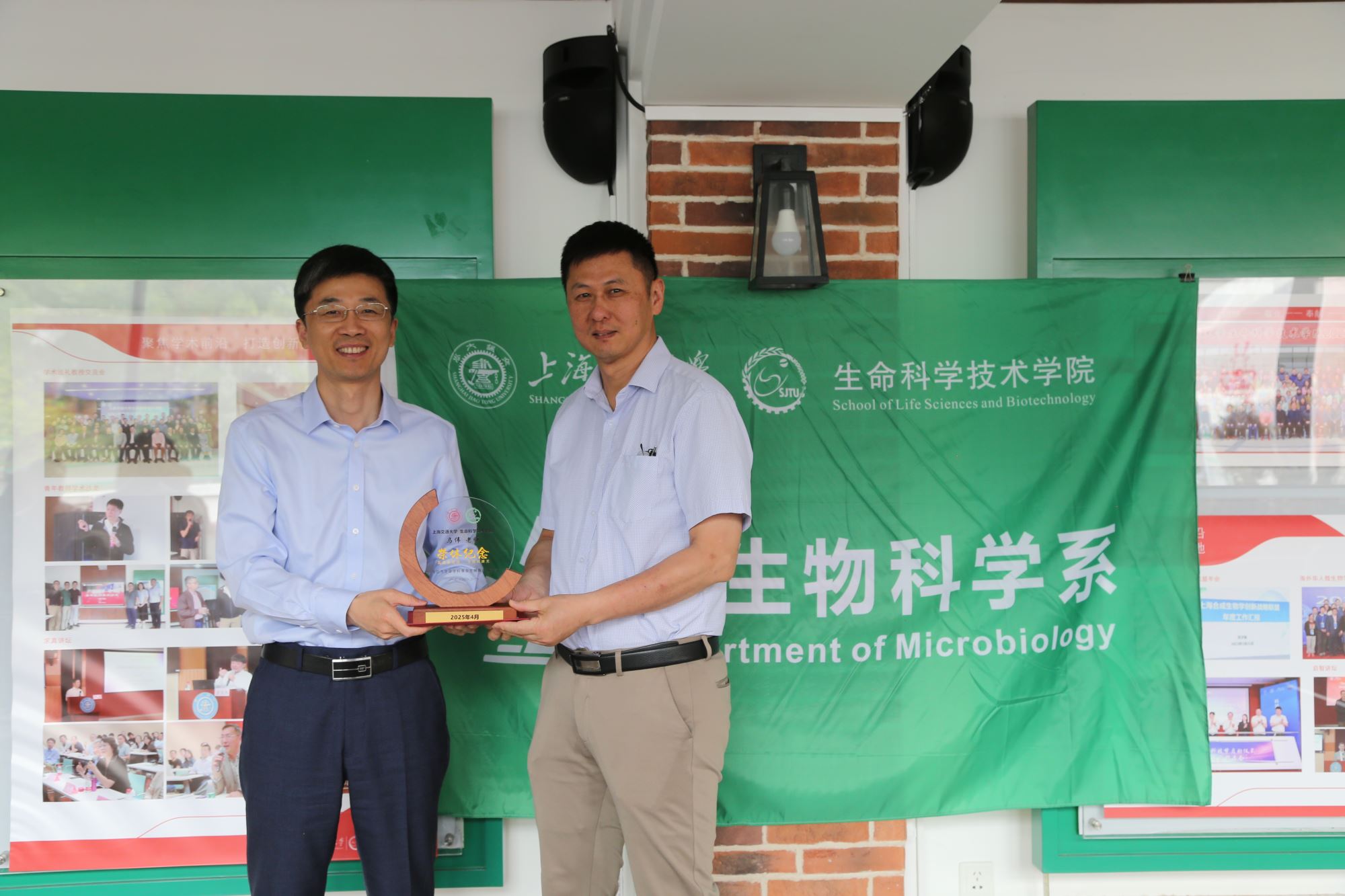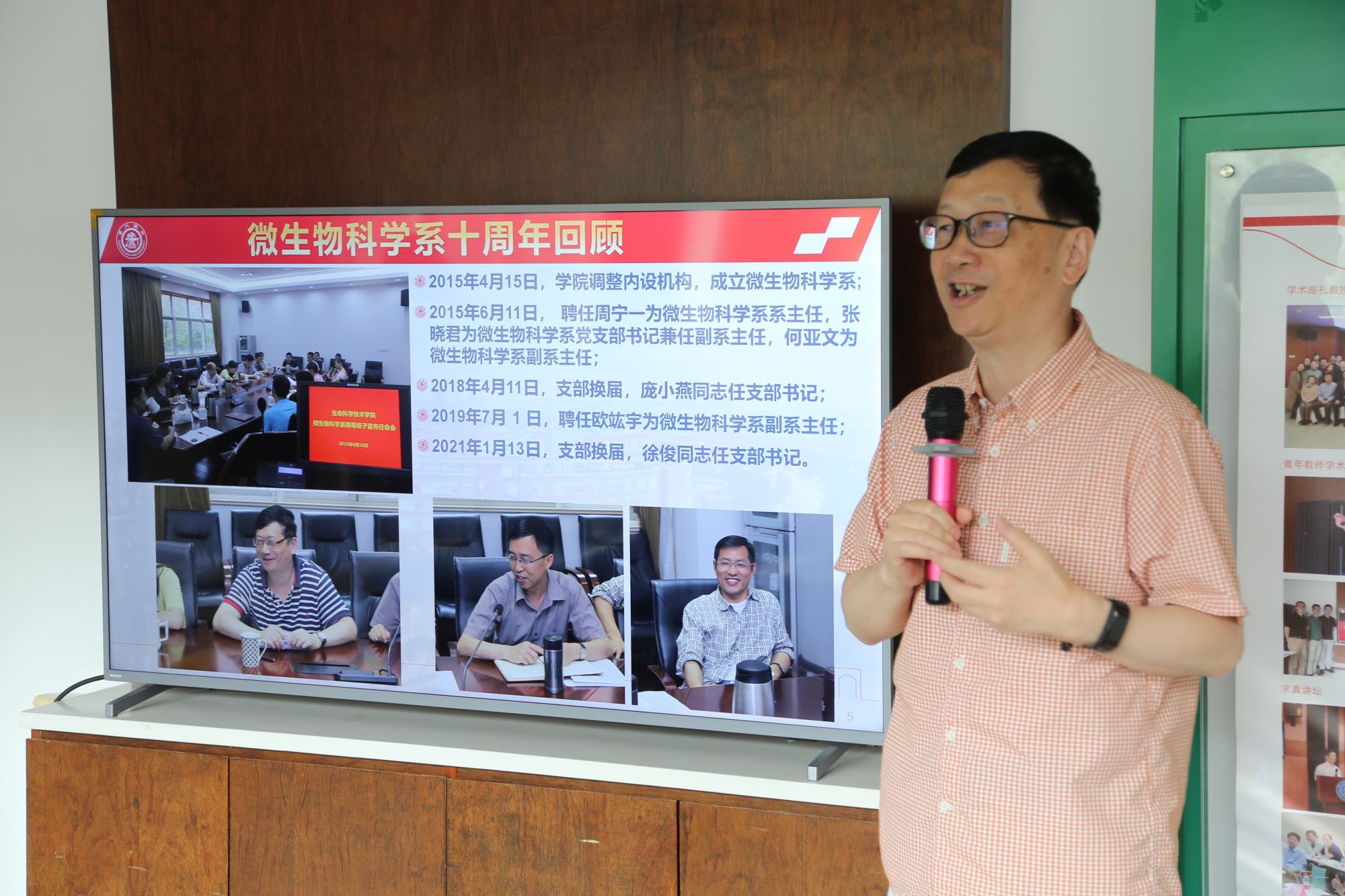 系主任周宁一教授通过精心制作的幻灯片,带领大家重温了微生物科学系从无到有、由弱变强的发展历程。活动期间,幻灯片循环播放了本系的研究团队构成及亮点成果,悬挂的系旗见证了微生物系全体师生的光荣与梦想。