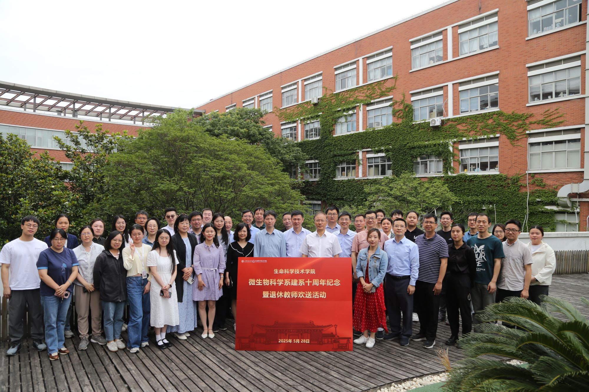 全体参会人员在教工之家露台合影留念。纪念活动的背景板在阳光下熠熠生辉,映照微生物科学系过去十年的卓越成就和更加美好的未来。