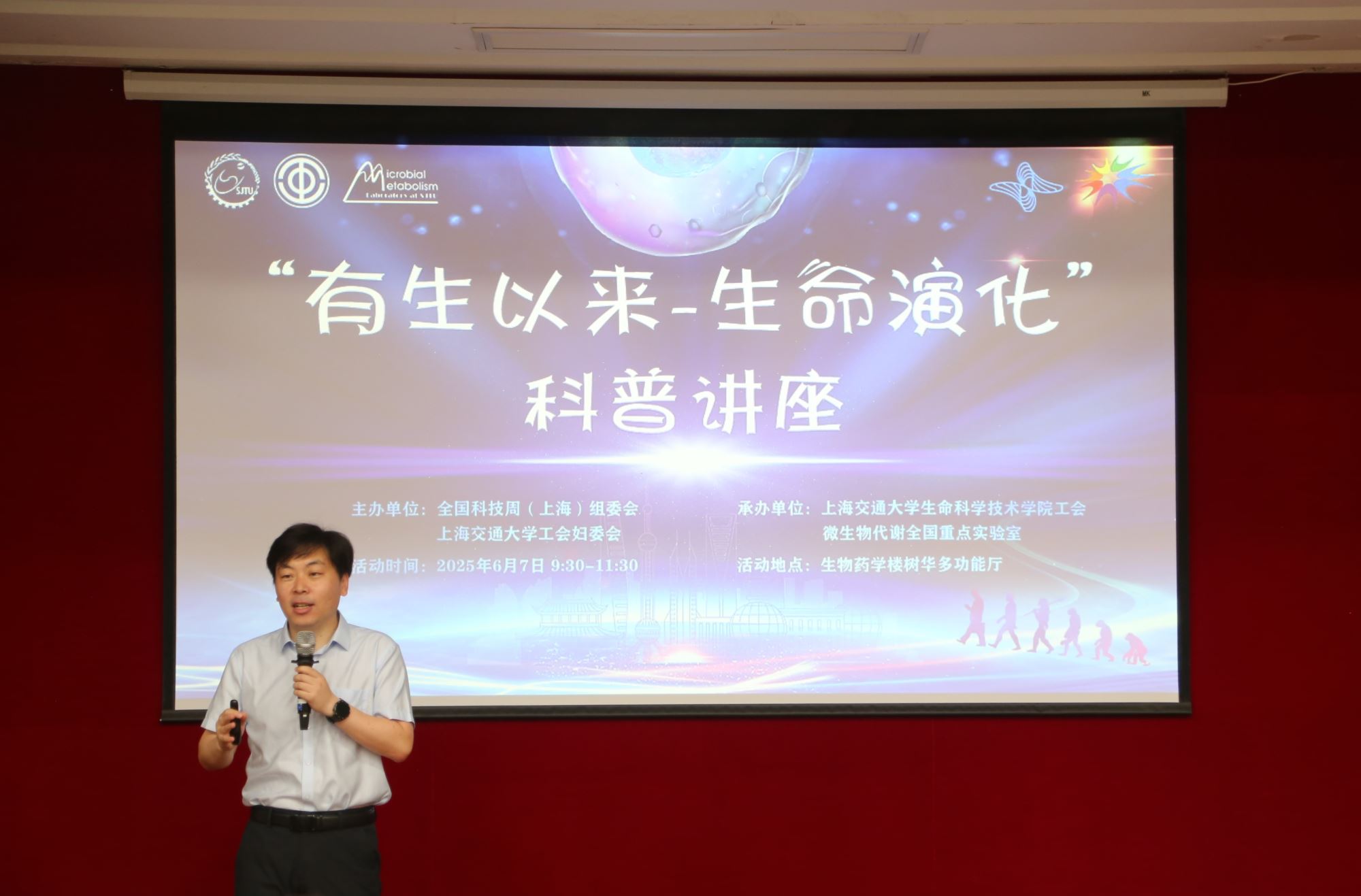 2025年6月7日上午,350vip8888新葡的京集团闵行校区350vip8888新葡的京集团树华多功能厅内座无虚席,一场主题为“有生以来-生命演化”的科普讲座在此精彩开讲。该活动由350vip8888新葡的京集团工会妇委会、全国科技活动周(上海)组委会主办,350vip8888新葡的京集团工会与微生物代谢全国重点实验室联合承办,吸引了校内外50组亲子家庭参与。特邀报告嘉宾刘晨光教授以生动的演讲和丰富的案例,带领现场观众开启了一场穿越38亿年生命演化的奇妙之旅。