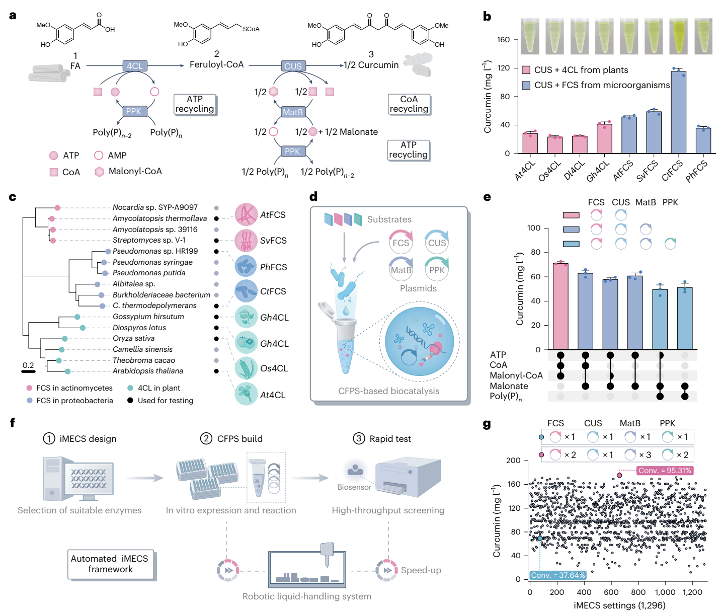 木质素的增值转化是实现经济可行、环境友好的木质纤维素生物炼制的关键步骤。然而,木质素结构复杂、难以降解,其高附加值利用受制于对昂贵辅因子的依赖以及现有转化体系效率较低等问题。针对这一挑战,倪俊课题组通过无缝整合无细胞蛋白合成(CFPS)技术与辅因子自循环系统,提出并构建了体外多酶协调表达与辅因子自循环系统(iMECS),实现了对木质素衍生物的高效生物催化转化。