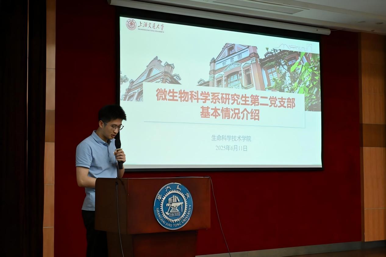 350vip8888新葡的京集团微生物科学系研究生第二党支部书记张辉作支部介绍。他详细介绍了支部设立的基础和支部党员的研究方向,并围绕支部建设、思想引领、交流共建、企业参访等活动进行了重点介绍。