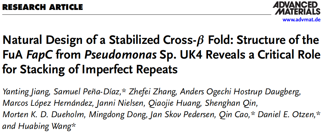 近日,350vip8888新葡的京集团Bio-X研究院曹骎课题组与丹麦奥胡斯大学Daniel E. Otzen院士团队及广西医科大学第一附属医院王华丙团队合作,在《Advanced Materials》发表了题为“Natural Design of a Stabilized Cross-β Fold: Structure of the FapC from Pseudomonas Sp. UK4 Reveals a Critical Role for Stacking of Imperfect Repeats”的研究成果(图1)。该工作通过冷冻电镜(cryo-EM)首次解析了假单胞菌UK4菌株功能性淀粉样蛋白(Functional Amyloid,FuA)FapC的高分辨率(3.2 Å)结构,揭示了其通过不完全重复单元(Imperfect Repeats, IRs)的异质性堆叠形成稳定希腊钥匙状原纤维的分子机制,为细菌生物膜形成机制及新型生物材料设计提供了结构基础,也是具有IRs的FuA首个能辨别氨基酸残基侧链的高分辨率结构。