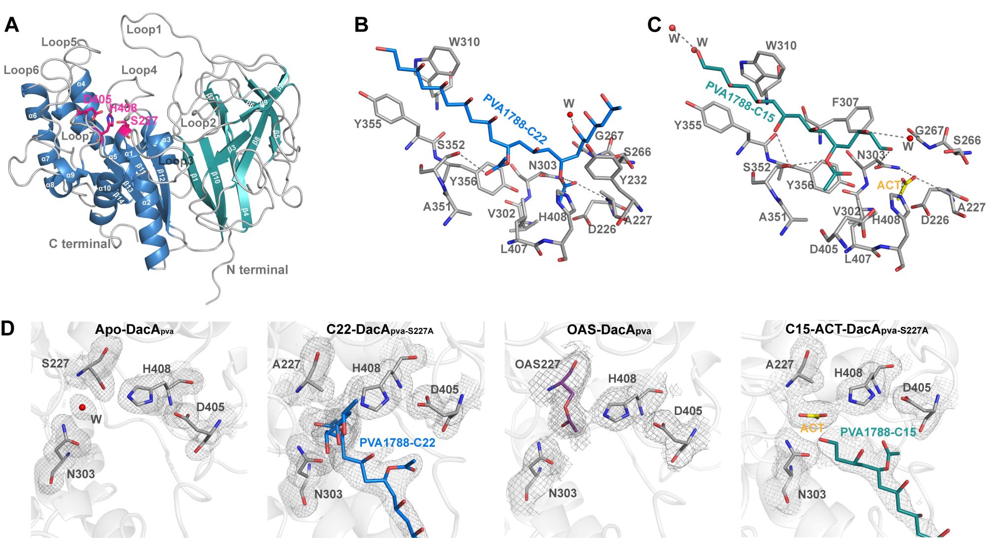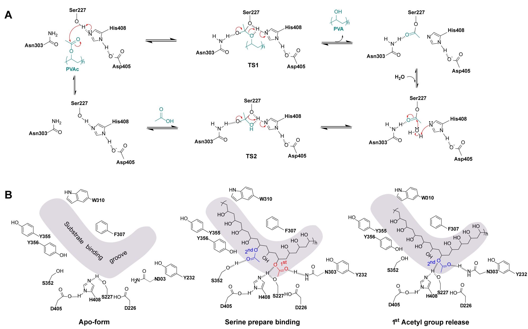 塑料污染已成为全球性环境挑战,而自然界中的微生物蕴藏着降解塑料的潜在“钥匙”。聚乙烯醇(PVA)及其乙酰化衍生物作为一种石油基的生物可降解塑料,在工业中广泛应用。前期,周宁一团队分离了一株利用聚乙烯醇的菌株Comamonas sp. NyZ500并从中筛选与鉴定出一种独特的PVA脱乙酰酶DacApva(Appl. Environ. Microbiol. 2021, 87 (8), e03016-20)。该酶能高效催化乙酰化PVA的脱乙酰反应,并具有广谱的O-乙酰化底物去修饰功能。然而,该酶如何识别并结合稳定碳-碳(C-C)链为主骨架聚合物的分子机制尚未知晓。