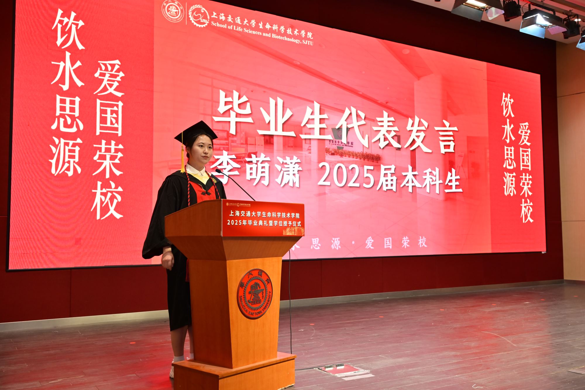 2025届本科毕业生代表李萌潇发言。她对学院、老师、同窗的培养和支持表示衷心感谢。她从自身经历出发,回顾了在交大和学院的温暖记忆,号召广大同学牢记“饮水思源,爱国荣校”的校训,面对世界百年未有之大变局,挺膺担当,继续奋斗,肩负起强国建设、民族复兴的历史使命。