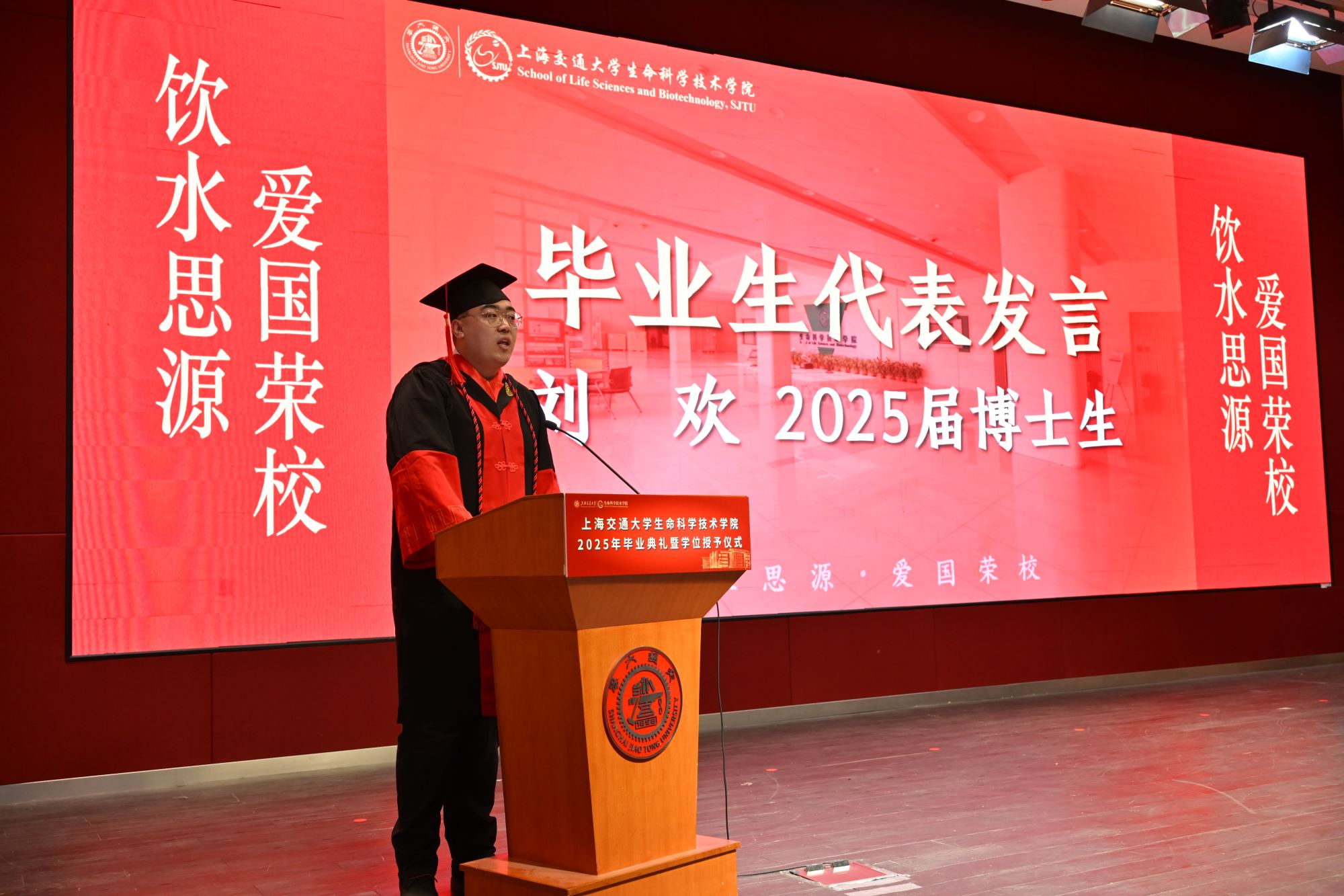 2025届博士毕业生代表刘欢发言。他回忆了在交大求学时光的点点滴滴,对学院提供的学术环境、老师们的言传身教、父母的支持陪伴表达了由衷的感谢。他表示未来将保持对知识的渴望、对生活的热爱,将个人理想与国家理想相结合,不怕困难,勇于探索,为国家发展贡献自己的智慧和力量。