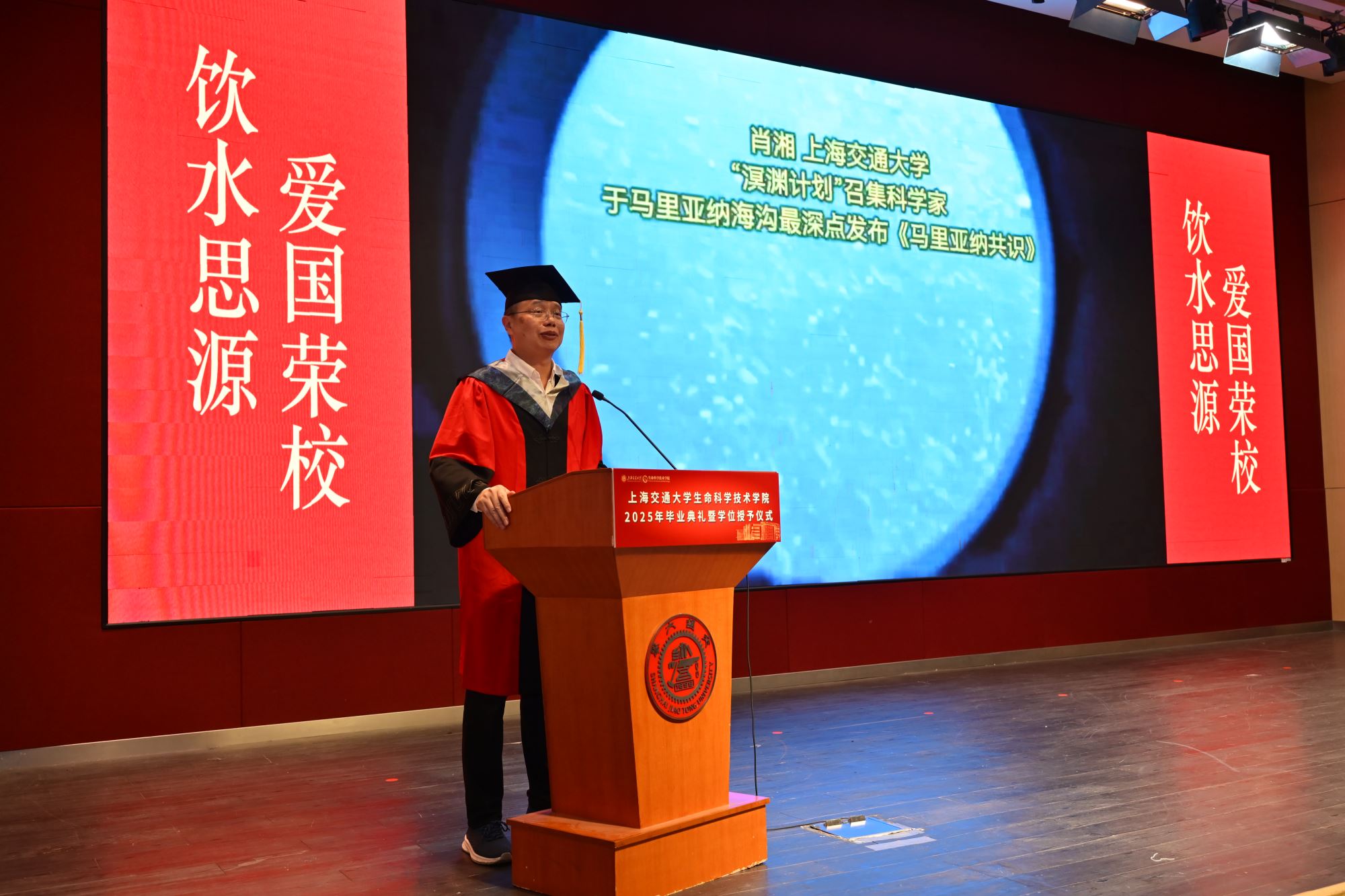 教师代表肖湘发言。他对全体毕业生予以祝贺,以自己深入深海,探索未知的经历,鼓励同学们怀揣对生命学科的好奇,保持热情,勇往直前,谱写属于自己的精彩篇章。