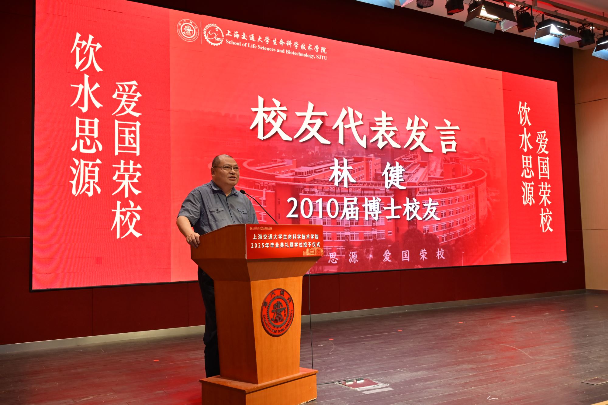 校友代表、江苏美通制药有限公司董事长、350vip8888新葡的京集团2010届博士校友林健发言。他结合自身的求学和创业经历,向即将毕业的学弟学妹分享了步入社会的经验,倡导同学们保持追求卓越的习惯,锚定人生目标,坚持攀高创新。